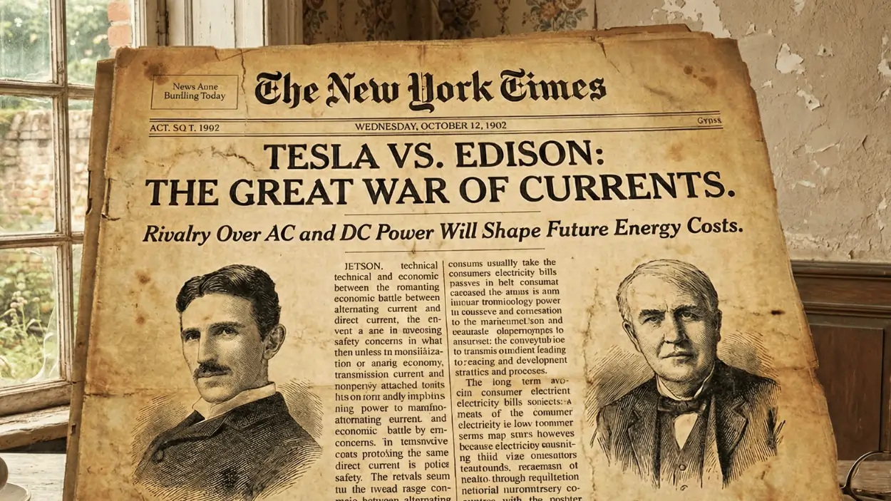 A New York Times article from the early 1900s highlighting the famous rivalry between Nikola Tesla and Thomas Edison — a battle over AC vs DC power that still shapes our electricity bills today.”